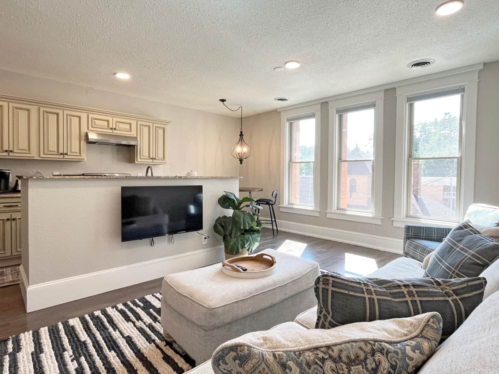 Built in 1905 and lovingly restored + updated, The Linnie Hawkins Suite on the second floor ofThe Evanston is a centrally-located stay in downtown Hot Springs, with just a 10-15 minute walkto the VA hospital and veterans home, pluscoffee, restaurants, Evans Plunge, and more also a few minutes walk away.